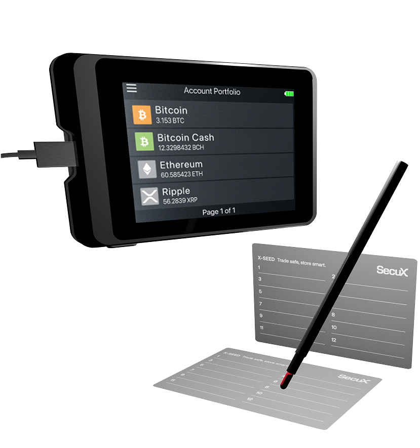 初心者向けのエントリーモデル・コールドウォレット。注:バッテリーは付属しません。X-SEEDリカバリーシートが2枚付属します。特徴:NFT対応、初心者にも手頃な価格、タッチスクリーン、10,000種類以上のコイン/トークンに対応、USB Micro-C、iOS/Android対応