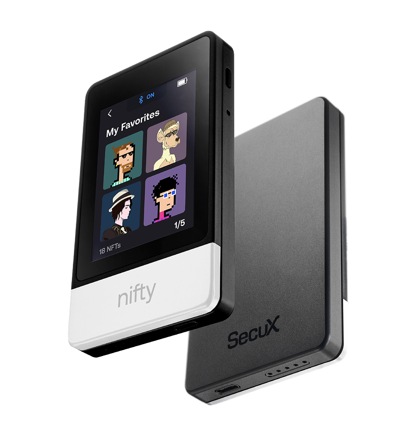 Designed for NFT collectors with DeFi and marketplace connectivity. Features: NFT Display/Support, Bluetooth, Touchscreen, Mobile iOS/Android, 5000+ coins/tokens, USB Micro-C